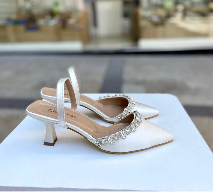 Beyaz, ipeksi kumaştan stiletto topuklu gece ayakkabısı, taş işlemeli ve nakışlı detaylara sahip. Düğünler için modern klasik tarzda. Satendir 6 cm yüksekliğinde sadece nişanımda bir defa giydim tertemiz rahat bir ayakkabı hem düğün nişanınızda ya farklı bir düğüne yada şık bir akşamda rahatlıkla kullanabilirsiniz