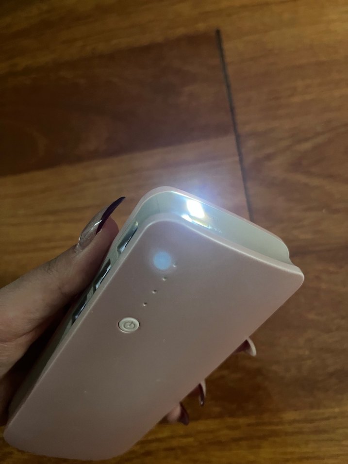 Bu beyaz taşınabilir power bank, birden fazla USB portu ve kullanışlı LED el feneri içerir. Kompakt ve taşıması kolaydır.