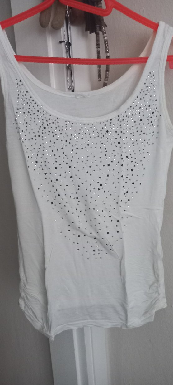 Pamuklu, beyaz, yuvarlak yakalı ve askısız kadın atlet, bol kesim ve ön kısmında TASLI detaylarıyla günlük rahat sokak stili için uygun. s/m✨