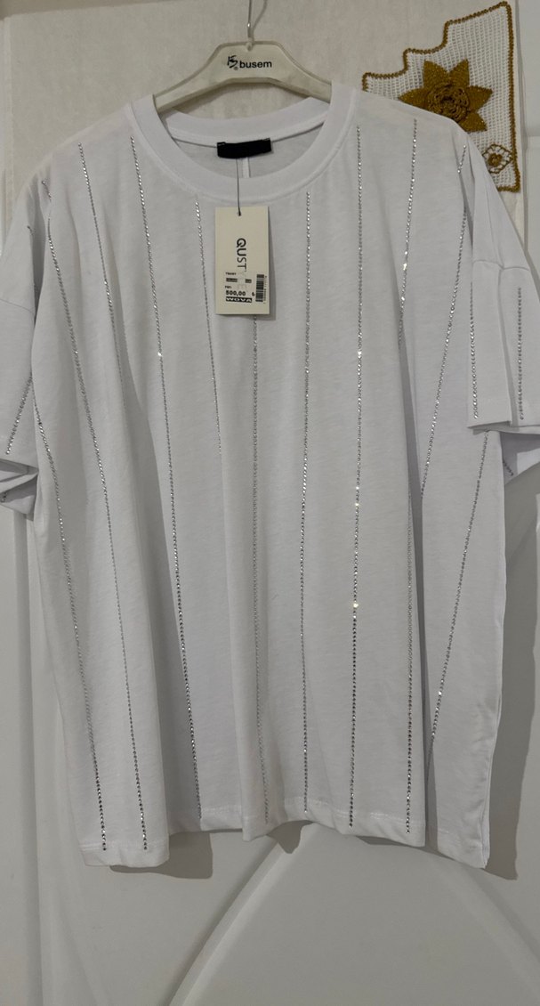 Beyaz pamuklu, kısa kollu, yuvarlak yakalı, payetli dikey çizgilerle süslenmiş bol kesim tişört. QUST markalı etiketli, günlük rahat stil için uygun. Marka temsili