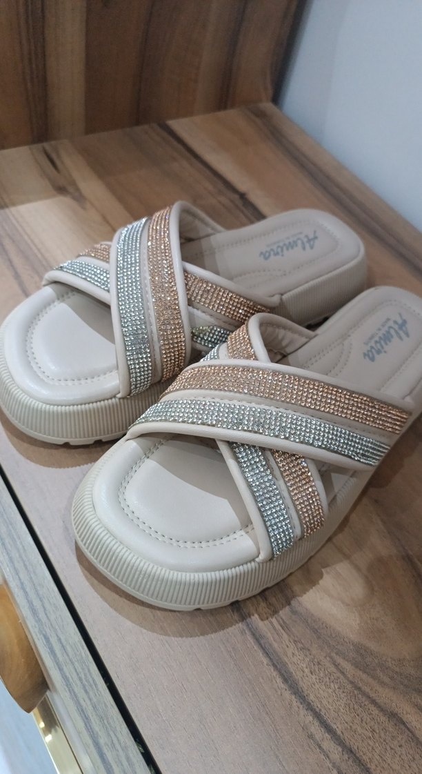 Beyaz renkli, taşlı bantlara sahip platform terlik. Kauçuk malzemeden yapılmış, günlük kullanıma uygun rahat ve şık bir model.