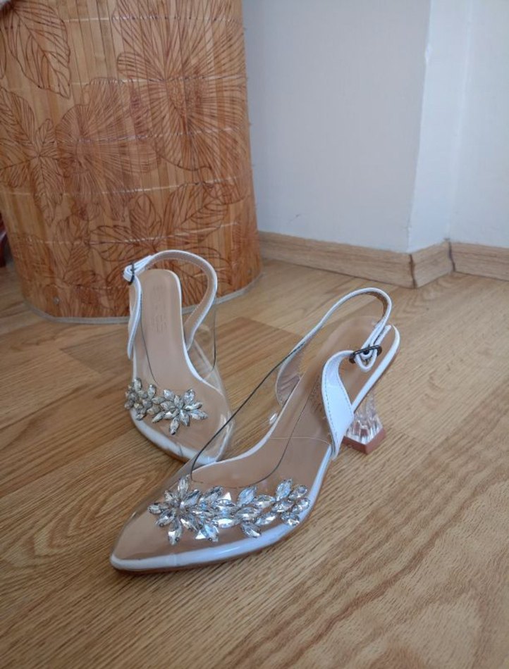 Beyaz, taş işlemeli, Şeffaf topuklu şık abiye ayakkabılar, düğün ve özel anlar için uygundur. Taşlar çıkartılıp takılabilir.Dar kalıp ✨