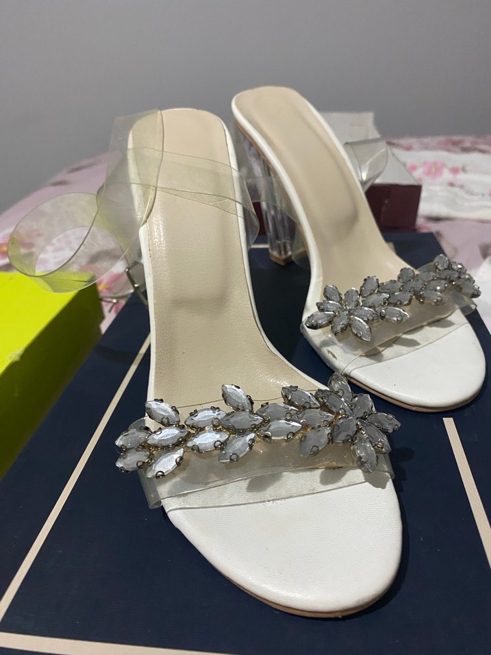 Beyaz tabanlı, taşlı ve şeffaf bantlı kadın topuklu ayakkabılar, düğün ve özel anlar için uygundur. Şeffaf topukları modern bir hava katar.