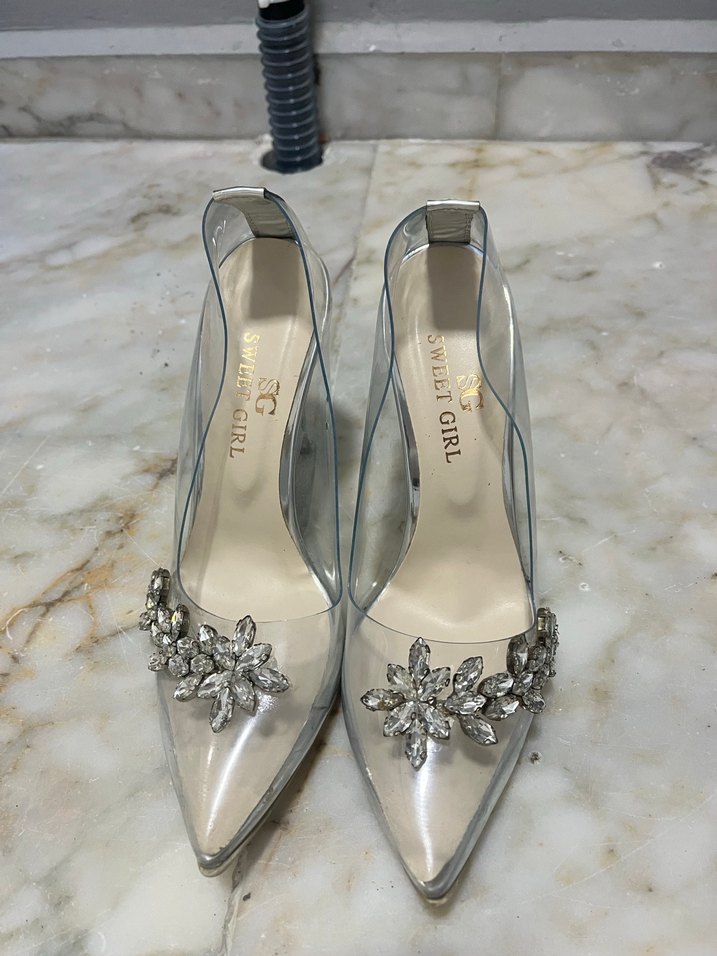 Kadın yüksek topuklu ayakkabılar, şeffaf cam görünümlü malzeme ve beyaz-gri taşlı çiçek süslemeleriyle. Modern klasik tarzda, düğünler için uygun. İçinde 'Sweet Girl' yazısı bulunur.