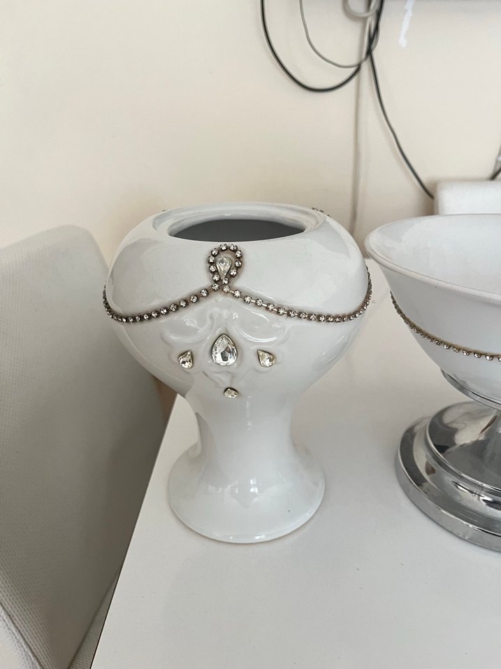Yuvarlak formda, dar tabanlı beyaz seramik vazo, gümüş boncuk ve taş detaylı süslemeye sahip.