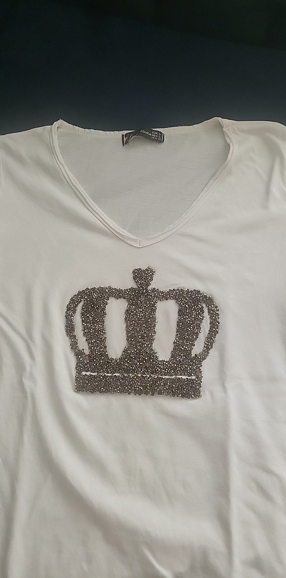 Gri nakışlı taç deseni bulunan beyaz penye T shirt. Kısa kollu, yumuşak kumaş.