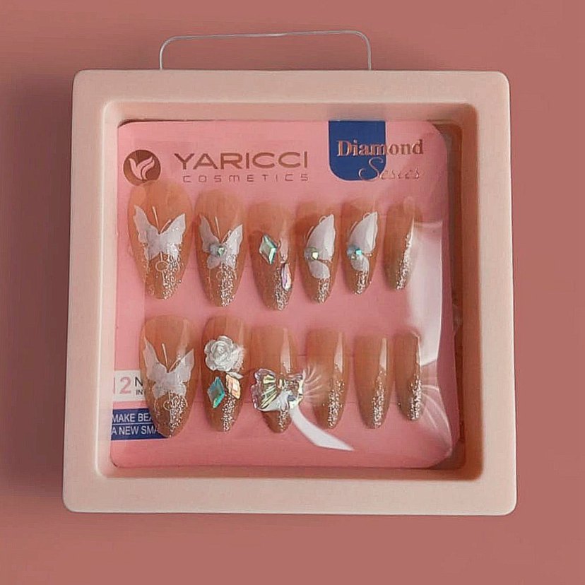 YARICCI markalı beyaz taşlı tırnak süslemeleri. Kelebek ve çiçek gibi farklı tasarımlar içerir.