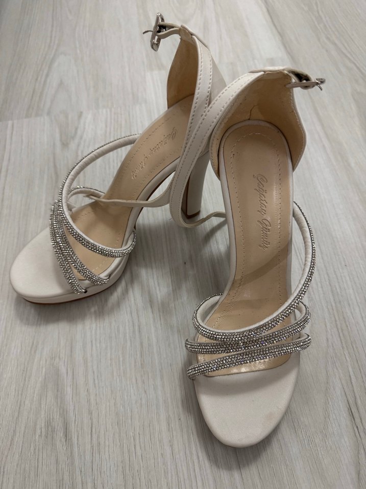 Beyaz, parlak baskılı bantlara ve tokalı kapanışa sahip yüksek topuklu kadın abiye ayakkabı. Sentetik kumaştan yapılmıştır, düğünler için uygundur. Gelin ayakkabısı