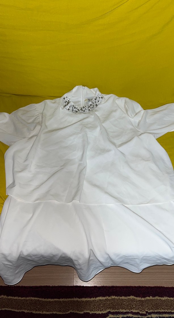 Beyaz tasli bluz, yakalı ve uzun kollu. Dökümlü, bol kesim ve midi boyda, düğünler için uygun.