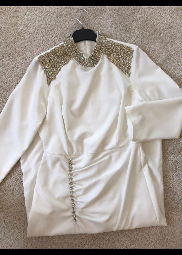 Yalnızca 2 saatliğine bebeğimin mevlütünde giydim. Astarlıdır. Beden 3 numara(40-42) uyum saglar belden oturmalıdır. Kolunda toz lekesi var.