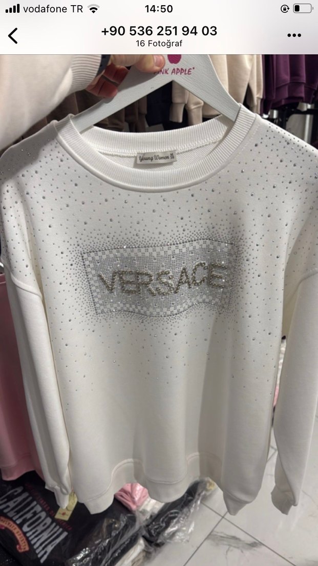 Beyaz Versace kadın sweatshirt, yuvarlak yaka ve uzun kollu. Payetli parlak detaylar ve baskılı desenle rahat, salaş kesim. ✨
