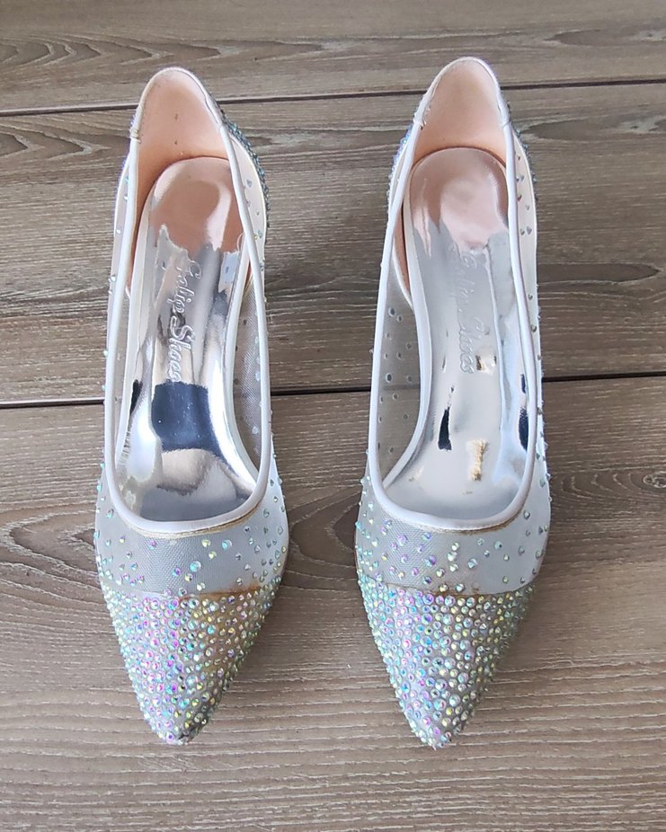 Beyaz, taş işlemeli kısa topuklu gelin ayakkabısı. Otel de giyildi sadece. Özel poşetlerinin ve kutusunun içinde saklandı.