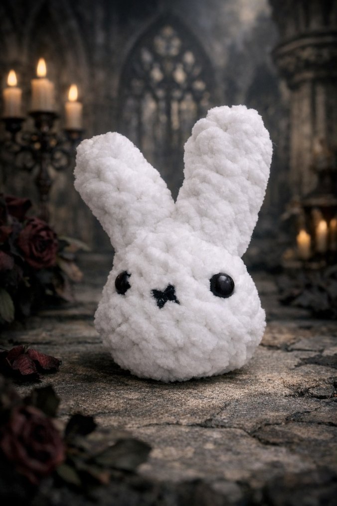 Siyah göz ve burun detaylarına sahip yumuşak beyaz peluş tavşan