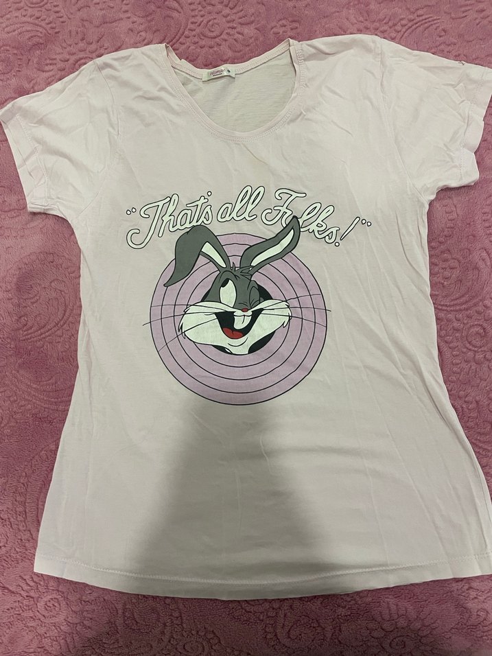 Beyaz pamuk kız T-shirt, pofuduk kısa kollu ve baskılı Bugs Bunny desenli. Salaş kesim ve yuvarlak yakalı, günlük sokak stili için uygun.