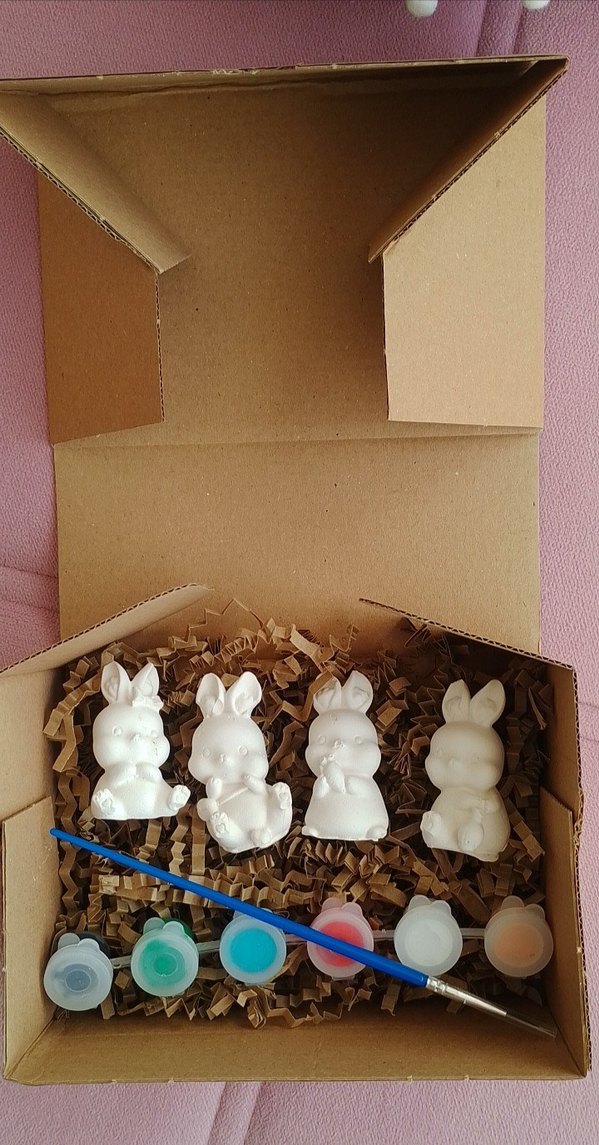 Dört beyaz tavşan figüründen oluşan boyama seti, fırça ve boyalar ile birlikte gelir.