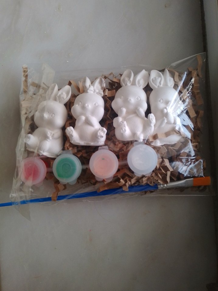 Dört beyaz tavşan figürü ve dört küçük boya kabı içeren çocuklar için yaratıcı boyama seti.