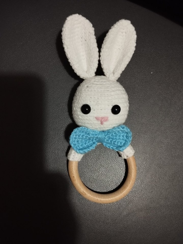 Pastel mavi fiyonklu beyaz tavşan figürlü, ahşap halkalı bebek diş kaşıyıcı. ve çıngırak
