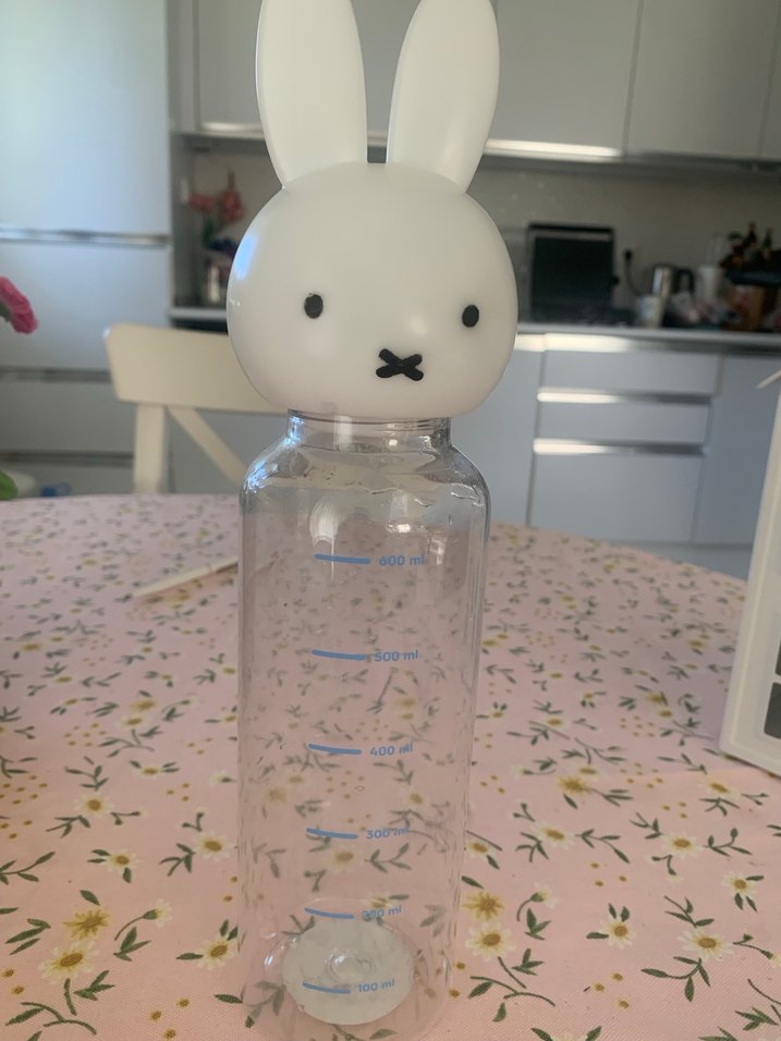Pastel beyaz renkte, ölçü işaretli şeffaf gövde ve tavşan şeklinde kapaklı çocuk suluk