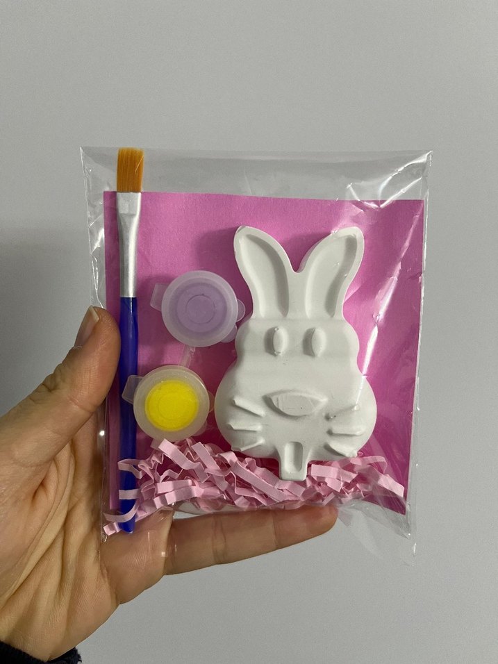 Beyaz tavşan şekilli figür, iki boyama kabı ve fırça içeren boyama seti, şeffaf poşette pembe kağıtla paketlenmiş. adet fiyatıdır