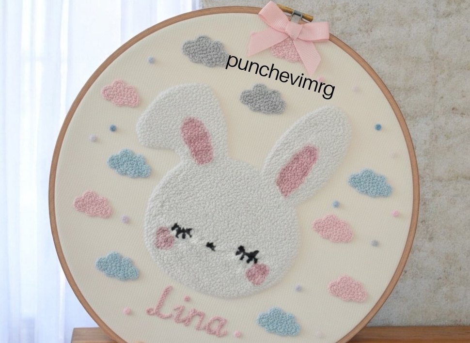 Beyaz zemin üzerinde pastel renklerde tavşan yüzü ve bulutlar bulunan çocuk duvar süsü. Yumuşak dokulu, eğlenceli tasarım. Sizde istediğiniz figürle istediğiniz renkte siparişinizi oluşturabılırsınız