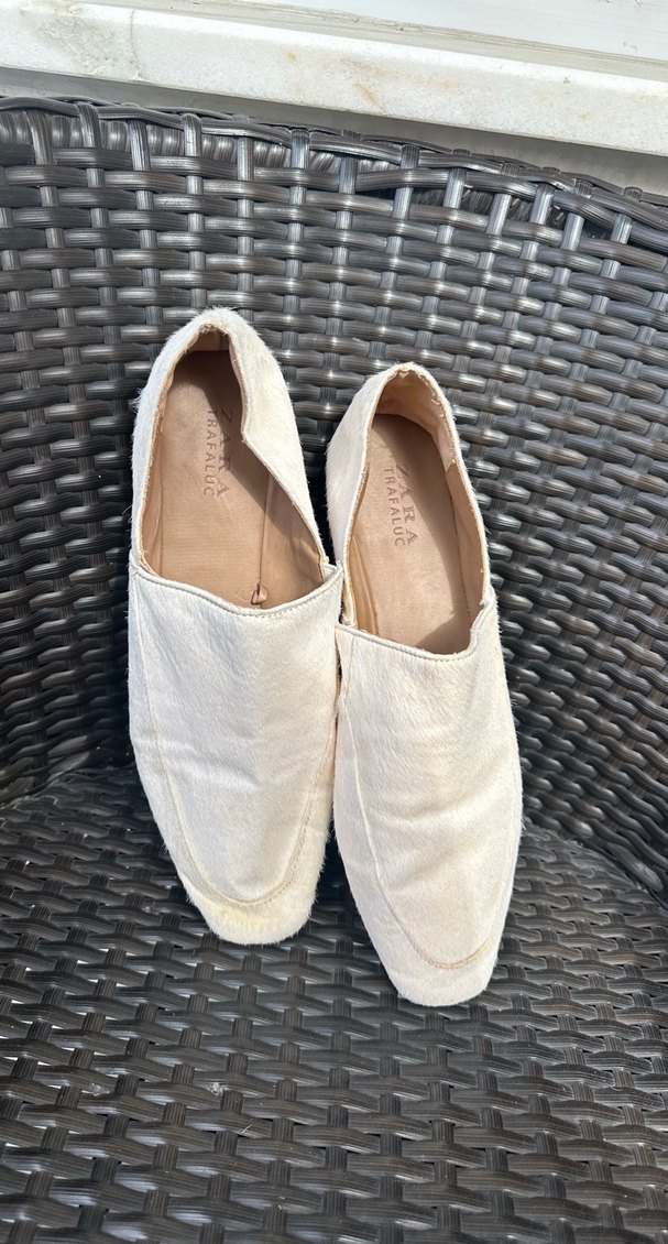 Beya espadril, sade ve minimalist tasarıma sahip. Günlük kullanıma uygun, bohem tarzıyla rahat bir görünüm sunar. 1-2 kez giyilmiştir ayakkabılıkta durmaktan dolayı giyilince düzelecek bir iz mevcuttur. Hiç bir sorunu yoktur gerçek deridir tay tüyüdür.