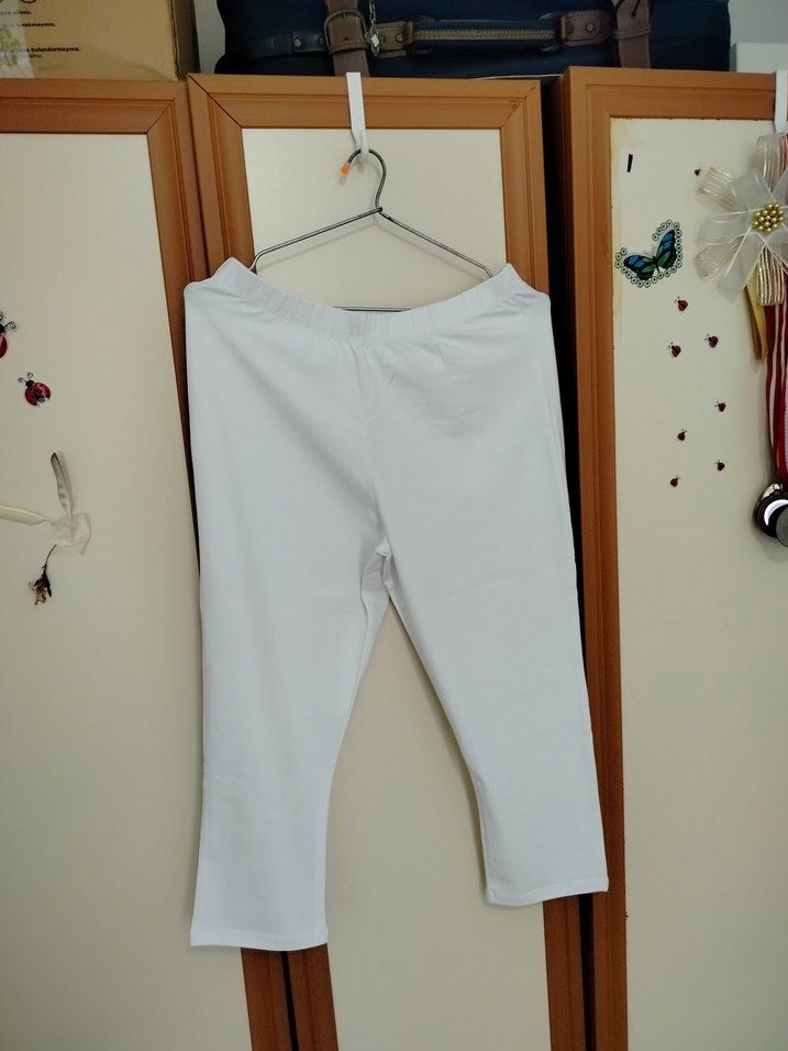 Beyaz renkte, pamuk kumaştan yapılmış, normal midi boyda, düz ve rahat kesim taytı. Günlük kullanım için uygundur, sade ve şık görünüme sahiptir.
