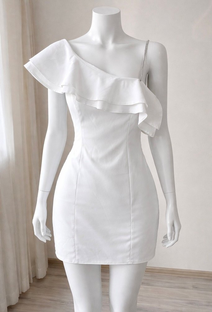 Bu beyaz mini elbise, tek omuzlu ve fırfırlı detaylara sahip, vücuda oturan kesimiyle dikkat çeker. Pürüzsüz sentetik kumaştan üretilmiştir. Parti düğün için uygundur. kusursuz sayılı giyildi 36 38 bedene rahat olur pazarlık payı vardır