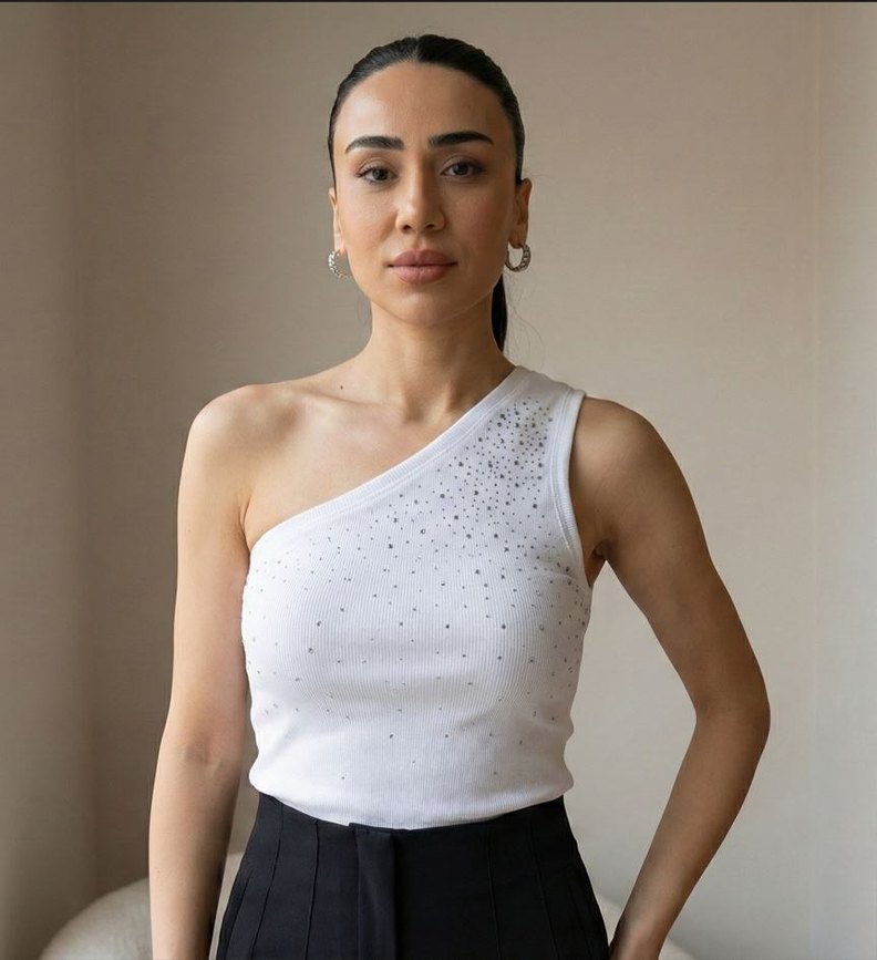 %100 Pamuklu ve fitilli kumaştan yapılmış, beyaz tek omuz, kısa ve payet detaylı, fitted kesim bluz. Günlük rahat kullanım için uygundur. ✨ Manken Boy: 163cm Kilo: 53 Manken Beden : XS