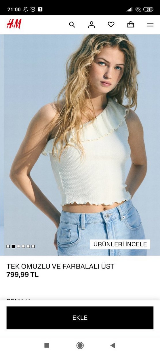 Tek omuzlu, fırfırlı detaylı beyaz denim bluz. Straplez yaka ve kısa kesim ile rahat, salaş bir görünüm sunar.