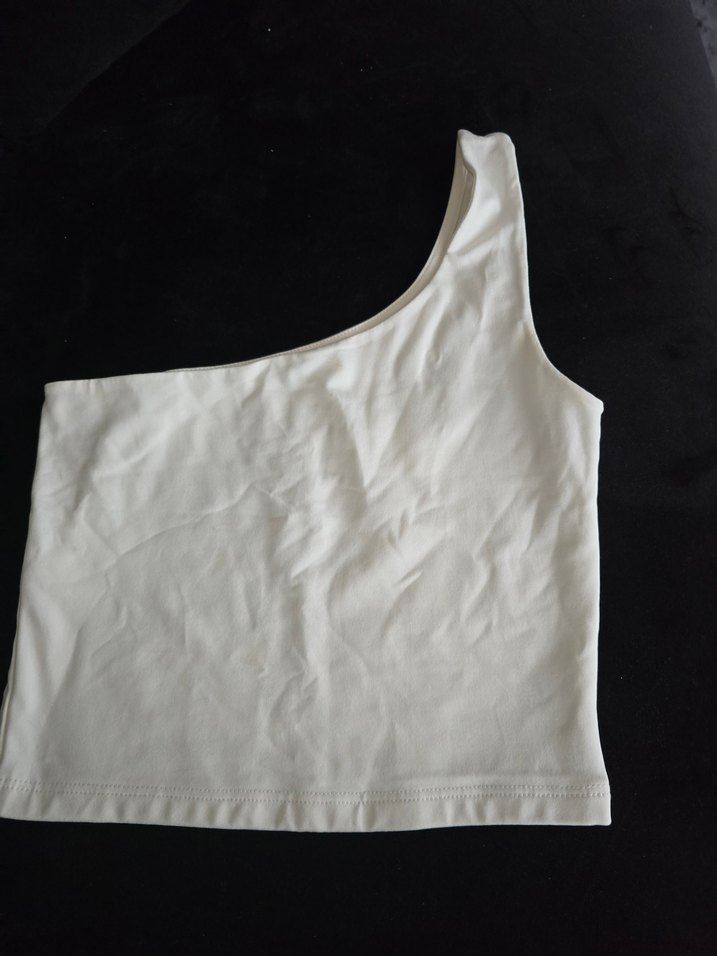 Beyaz, tek omuzlu ve kolsuz crop top. Düz, ince ve vücuda oturan yapısıyla günlük sokak stili için uygundur.