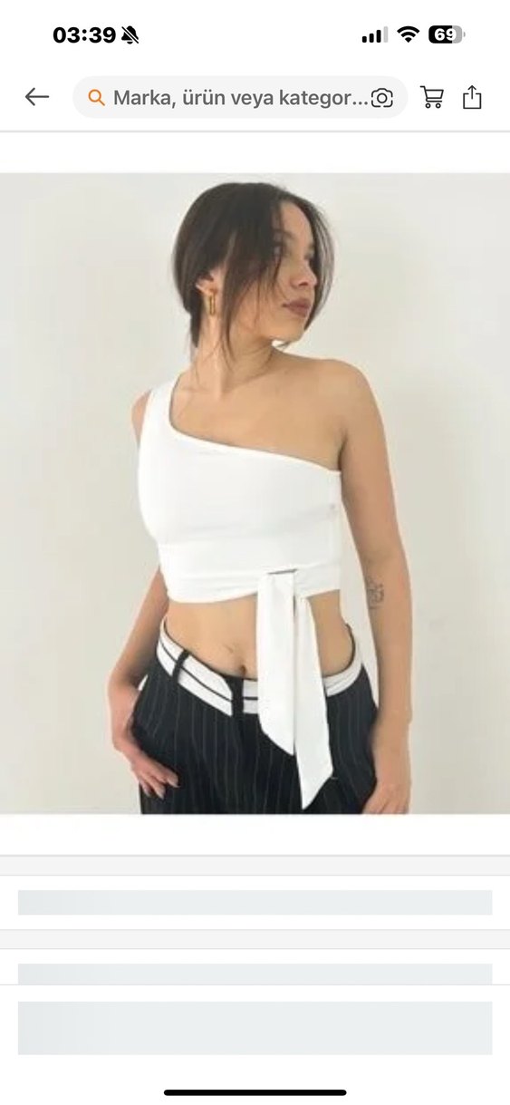 Beyaz crop top, tek omuzlu ve askılı kısa kesim. Pamuklu kumaştan, kemer detayıyla şık ve rahat bir görünüm sunar.