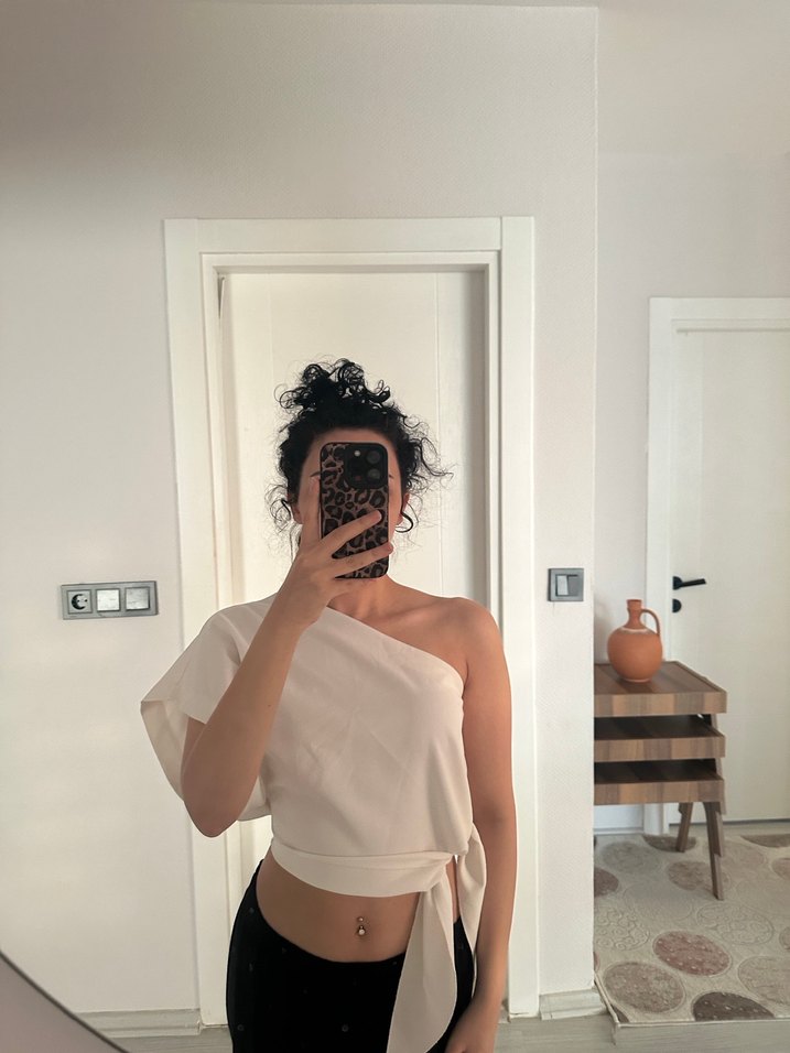 Beyaz, tek omuzlu ve kısa kollu, şeffaf ve ipeksi kumaştan yapılmış, vücuda oturan bluz. Normal midi boyda, minimalist ve sokak stili, günlük kullanıma uygun. ✨