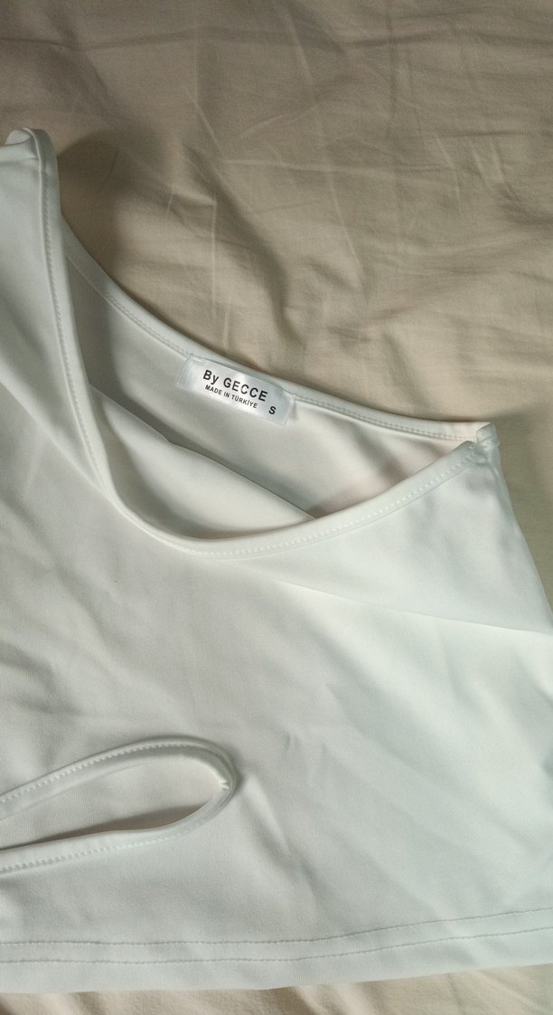 Beyaz renkte, tek omuz tasarımlı, uzun kollu ve vücuda oturan kesime sahip bluz. Defosuz hiç giyilmedi