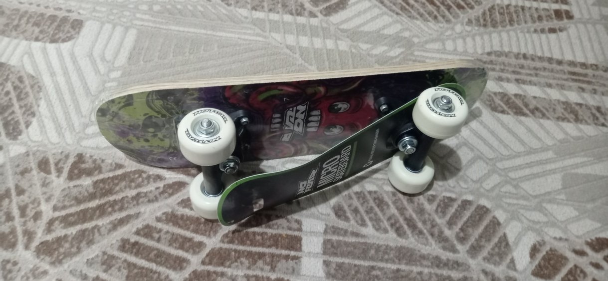 Beyaz tekerlekli, canlı grafiklere sahip karanlık renk çocuk kaykay. Genç sürücüler için uygun.