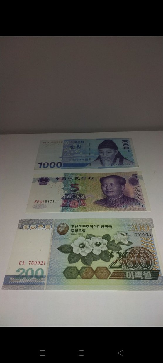 Beyaz ve açık tonlarda üç farklı banknot, çeşitli tasarım ve değerlerle. Eşsiz bir hediye olarak uygun. Kuzey Kore won Güney Kore won çin yuan