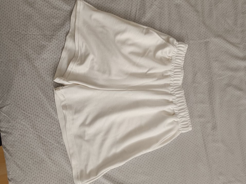 Beyaz renkli, pamuklu kumaş ve bol kesim hamile mini şort. Lastikli beli ve desensiz sade tasarımıyla günlük sokak stiline uygundur.