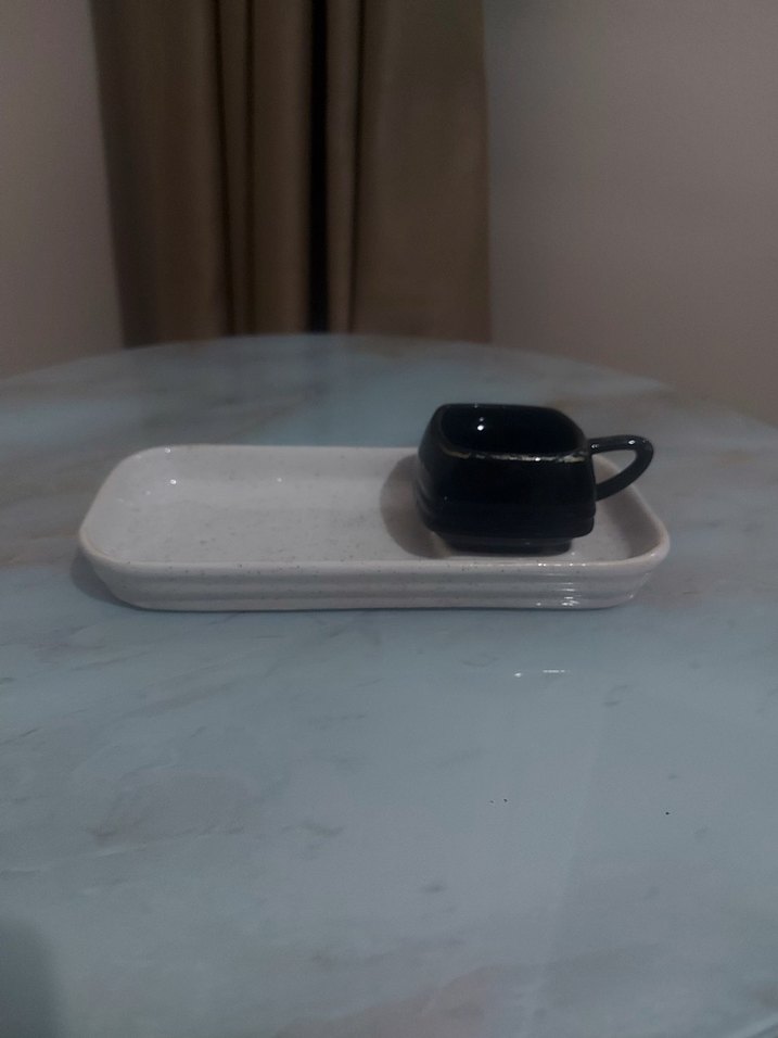 Beyaz dikdörtgen tepsi ve küçük siyah fincan, içecek servisi için uygundur. ☕