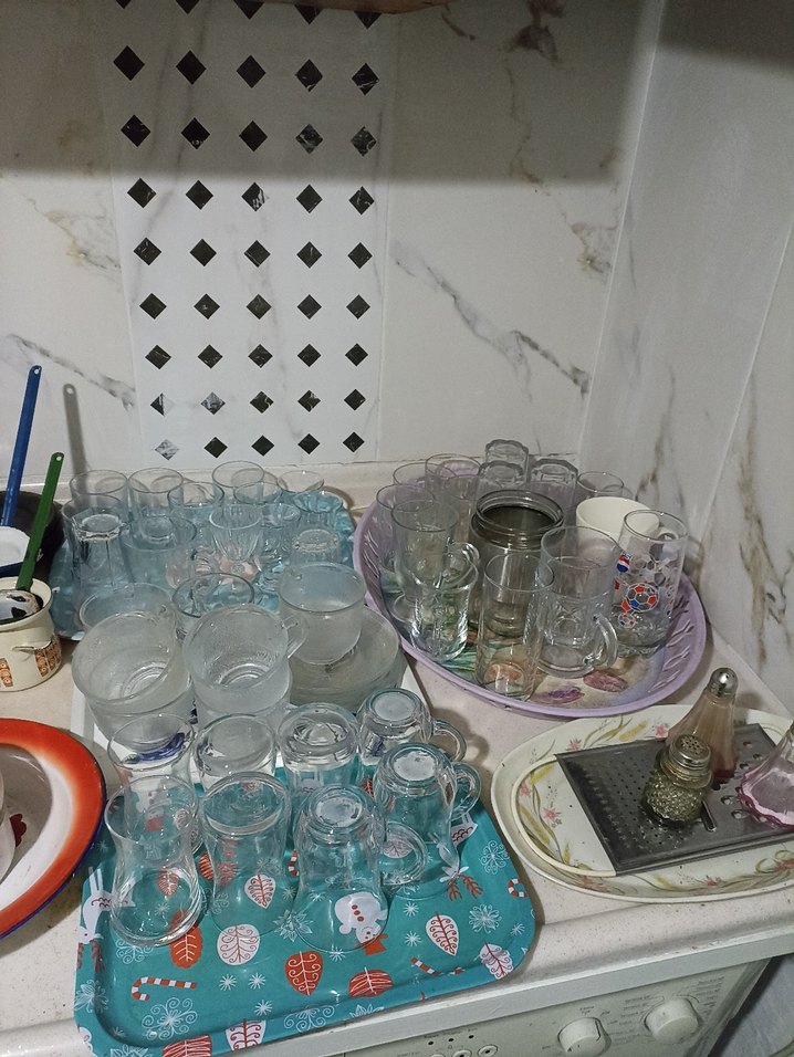 Beyaz tepsiler üzerinde çeşitli cam bardaklar ve renkli desenli bardaklar mutfak tezgahında yer alıyor.