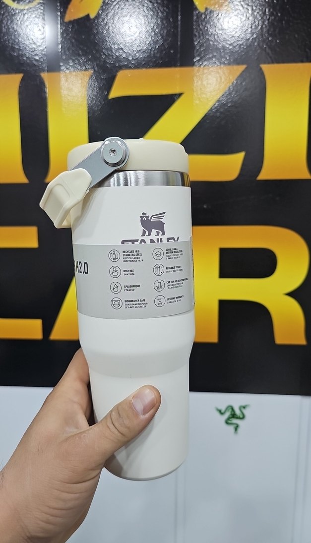 Beyaz renkli çocuk termos şişesi, paslanmaz çelik yalıtımlı ve güvenli açılır kapaklıdır. 2.0 kapasiteye sahiptir ve taşınması kolaydır.