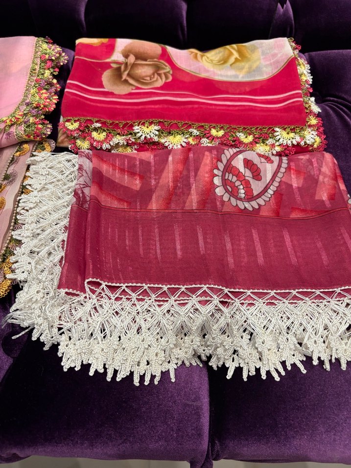 Renkli, dantel kenarlı kadın şalları, yumuşak tekstil kumaşından, bohem ve retro tarzda.