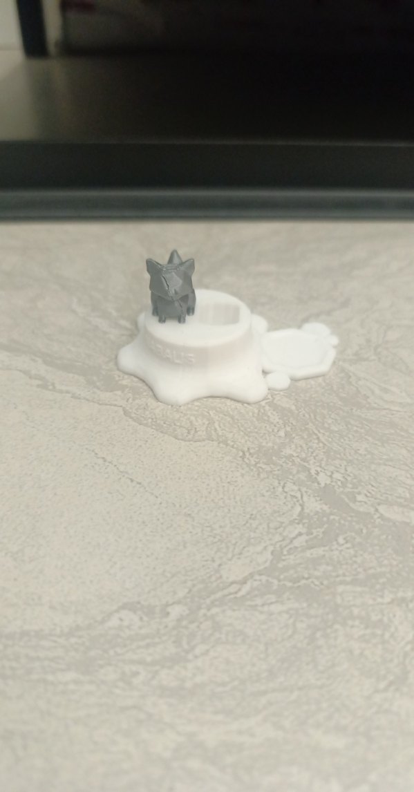 Üzerinde küçük gri kedi figürü bulunan beyaz kedi aksesuarı, dekorasyon amaçlıdır.