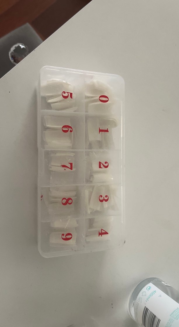 Sayısal bölmelerde beyaz tırnak süsleri bulunan şeffaf kutu, tırnak süsleme için uygundur.