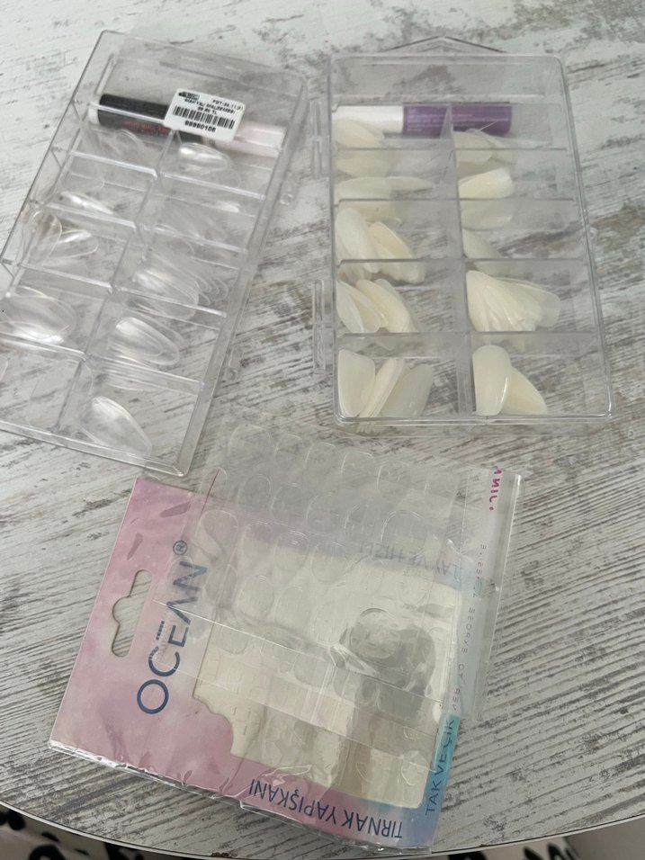 Farklı boylarda beyaz tırnak takma uçları ve yapıştırıcı içeren set, şeffaf kutuda düzenli şekilde saklanmıştır. Ve takma kirpik