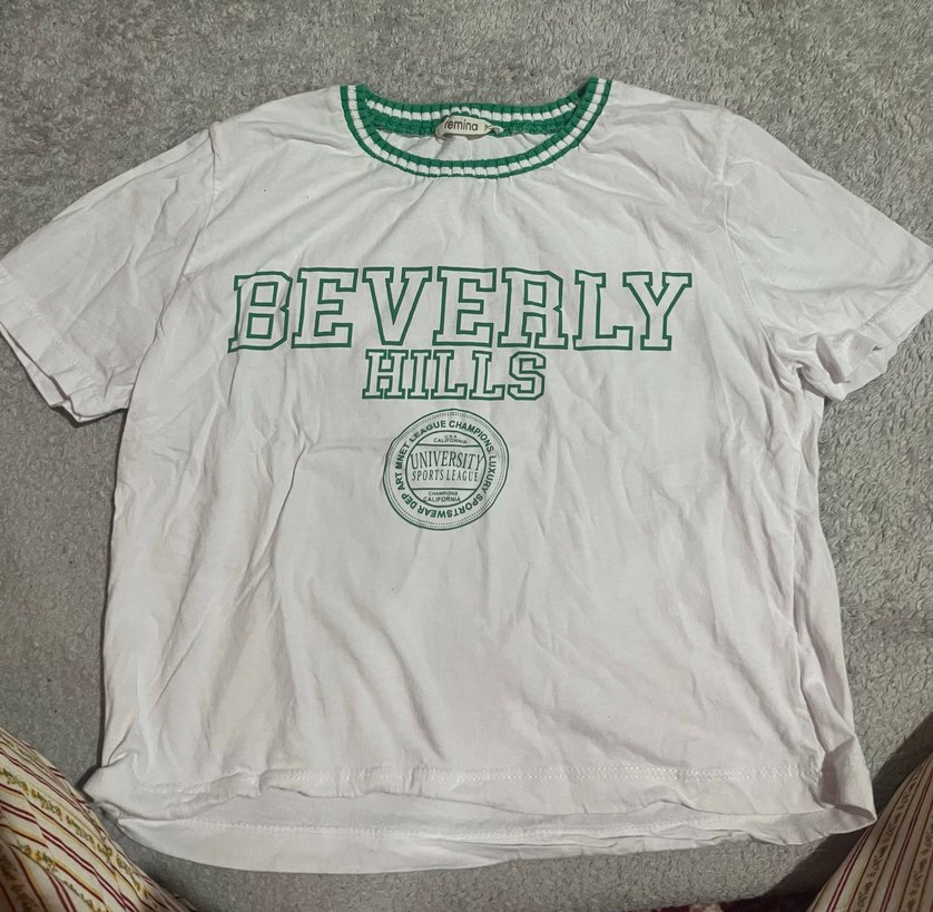 kısa kollu, yuvarlak yakalı, rahat kesim keten kumaştan beyaz tişört. Üzerinde 'Beverly Hills' baskısı ve kemer detayı bulunur. Trend sokak stili için uygundur.
