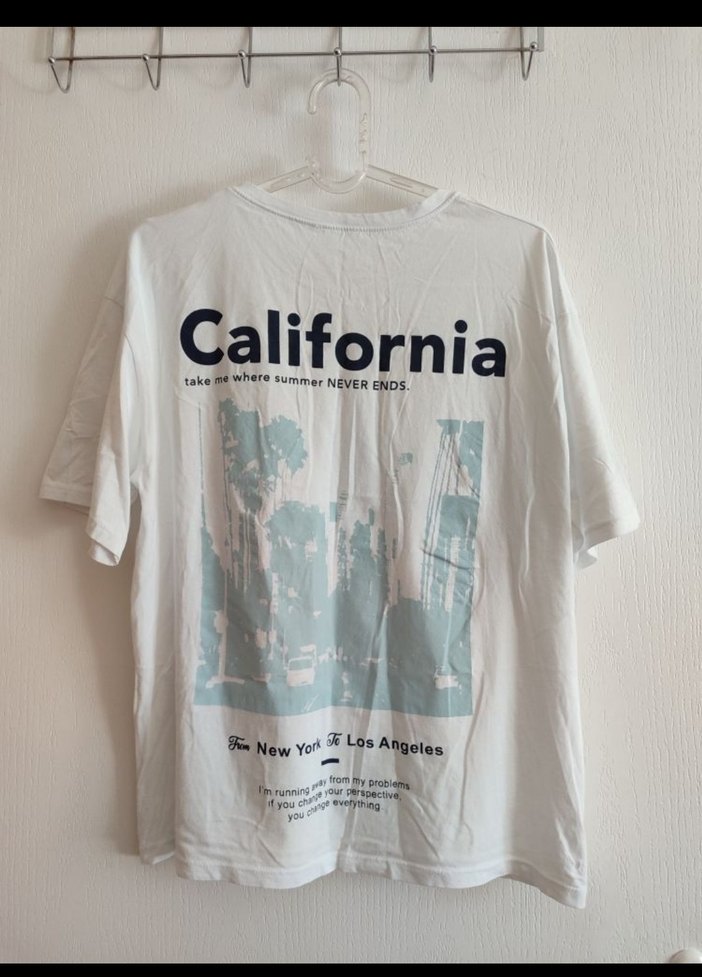 Pamuklu, kısa kollu, yuvarlak yaka ve bol kesim beyaz tişört, California baskılı. Günlük kullanıma uygun rahat bir model.