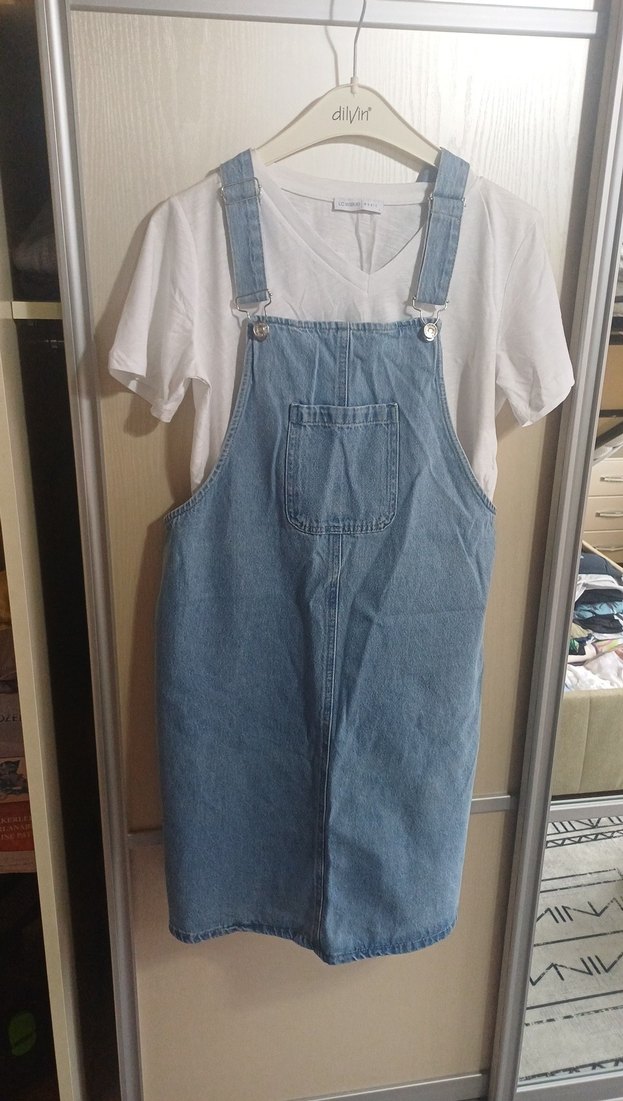 Beyaz kısa kollu tişört ile ön cepli, bol kesim denim midi salopet rahat ve şık bir görünüm sunar. tsort hic kullanilmadi. elbiseyi 2 kez kullanip yikadim. elbise m beden, tşört s bedendir.