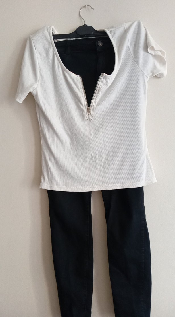 Bu beyaz, kısa kollu kadın tişörtü, ön fermuar detayı ve yuvarlak yakasıyla rahat bir kesime sahiptir, yumuşak penye kumaştandır. likralidir en 40boy 50 pantolon bel 40 boy 90