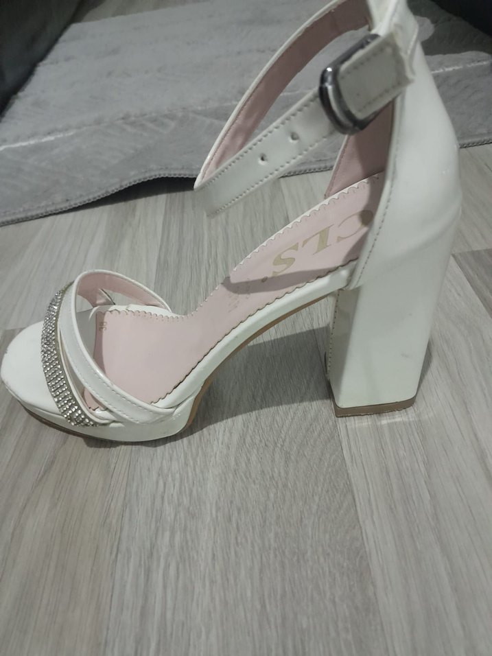 FİYAT 500 tl fiyatta yardımcı olurum Beyaz blok topuklu, tokalı kayışlı ve hafif yılan derisi desenli kadın abiye ayakkabı. Klasik zarafet için düğünlerde tercih edilir.