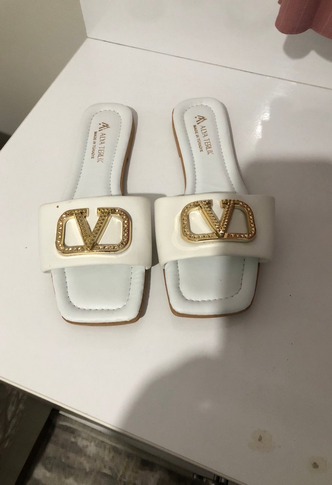 Beyaz, tokalı ve nakışlı parlak detaylara sahip blok topuklu kadın terlikleri, kauçuk malzemeden üretilmiştir.