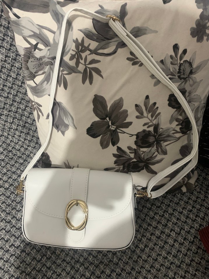 Beyaz sentetik kumaştan yapılmış, tokalı ve yılan derisi desenli bohem kadın çantasıdır.